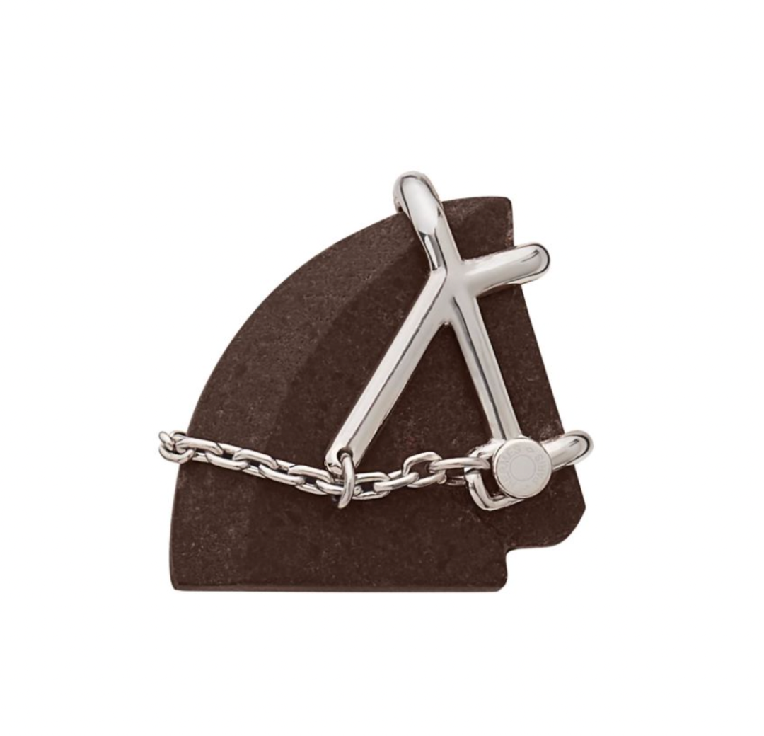 鞍具款式的Petite Course Box小牛皮手袋亦从马术领域汲取多项灵感元素,其造型源自赛鞍鞍裙,拉袢参考马衔,饰以马鞍钉并保留了不对称圆形结构。由镀钯金属装饰的Vulcanium别针是对骏马的微雕造型,皮革工艺的大胆创新实现了对马元素的精雕细琢,又添灵动趣味。