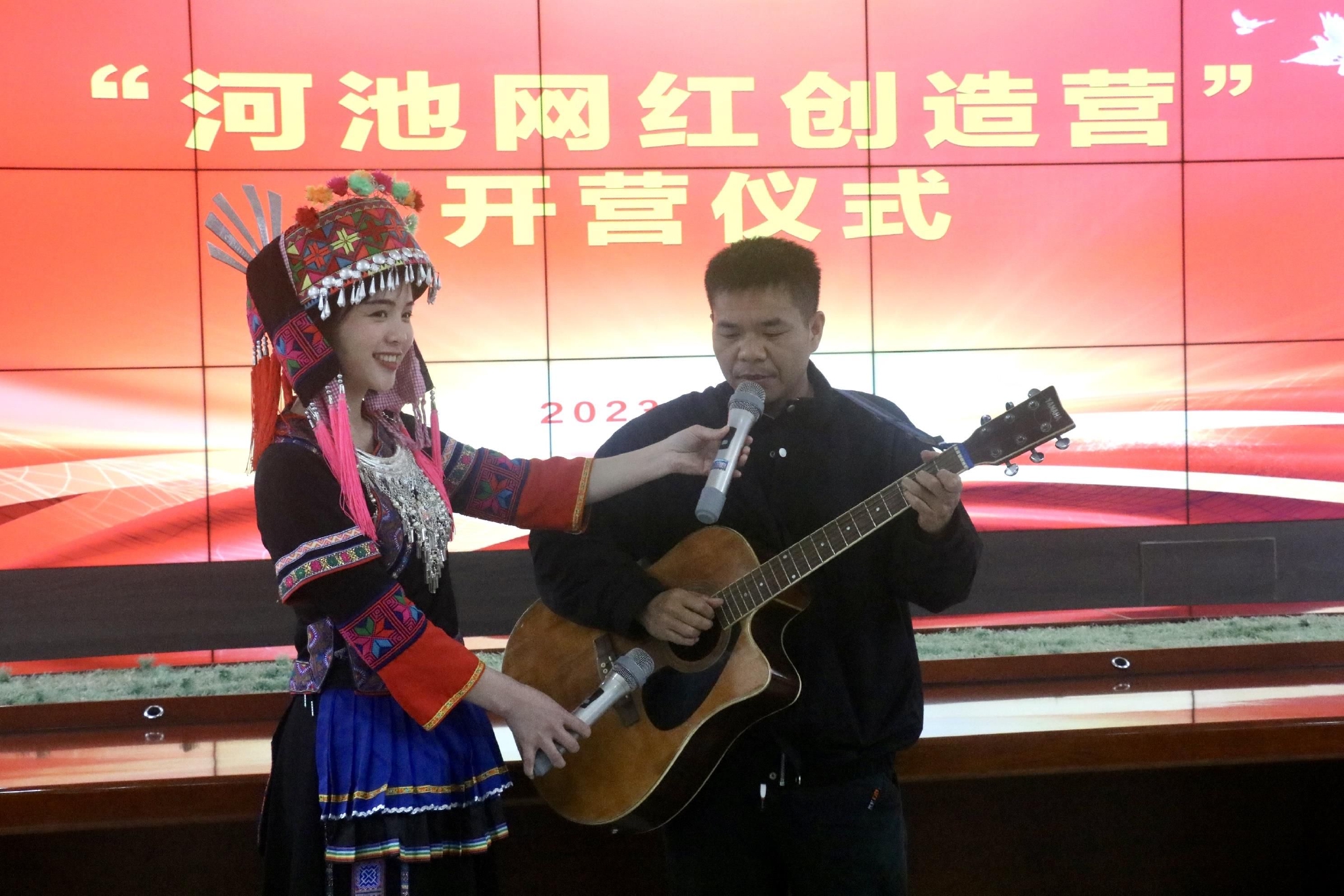 网红代表吴恩师现场献歌。为了全面贯彻落实党的二十大精神,助推“六新河池”建设,2022年底,河池市委网信办、河池日报社联合搭建“河池网红创造营”,激发河池网红创新创业,履行社会职能,弘扬时代旋律,维护网络空间清朗,让“正能量”成为“大流量”,让“好声音”成为“最强音”。
