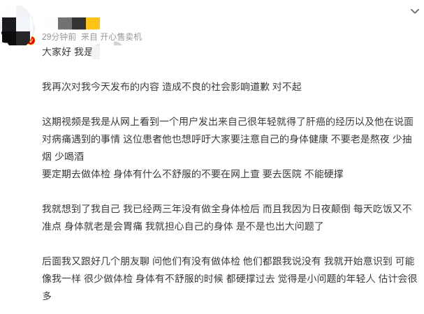 间隔半小时后,该博主再次发布长文道歉,并解释自己拍摄虚构肝癌患者内容,是“为了让这期视频能给大家敲响重视自己身体的警钟,才想着用第一人称的方式来呈现出来。”