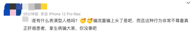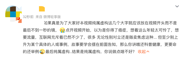网友@奶钙:博主你知道我作为一个得过癌症的患者,看到视频最后的心情吗?你有良心吗?网友@李苹果干:笑死,我也是服了我自己无处安放的同情心网友@viv_misscai:真的是为了博流量没有底线!网友@August:真的无语了,而且纯属虚构的那个就一闪而过,我想要截图看那个内容都截了好几次