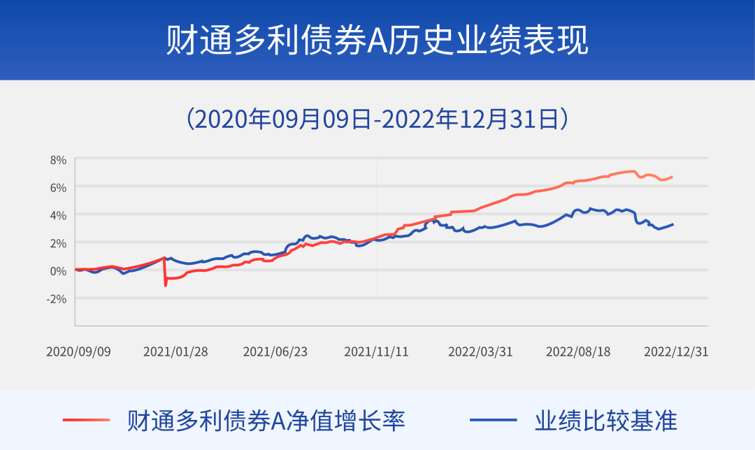 数据来源:排名数据来源于海通证券2023年4月1日发布的《基金业绩排行榜》,截至2022.03.31,财通多利债券A近1年(2022.04.01-2023.03.31)绝对收益排名位列同类(纯债债券型)139/1716。净值增长率来自财通基金产品定期报告,财通多利债券成立于2020年9月9日,自2021年11月26日起增设收取销售服务费的C类份额,原份额变更为A类份额,2022年8月10日起增设收取销售服务费的E类份额;罗晓倩自2021年10月22日开始任职基金经理,闫梦璇自2022年7月8日开始任职基金经理;A类从2020.9.9到2022.12.31期间,完整会计年度收益率(同期业绩比较基准)为2.46%(2.10%)、3.17%(0.51%);C类从2021.11.26到2022.12.31期间,完整会计年度收益率(同期业绩比较基准)为3.08%(0.51%);截至2022.12.31,A类基金净值增长率(同期业绩比较基准)成立以来6.41%(3.23%),近一年3.17%(0.51%);截至2022.12.31,C类基金净值增长率(同期业绩比较基准)成立以来3.82%(0.96%),近一年3.08%(0.51%);历史数据仅供参考,我国基金运作时间较短,基金的过往业绩并不预示其未来表现,基金管理人管理的其他基金业绩不构成基金业绩表现的保证。基金有风险,投资需谨慎。财通多利债券A历任基金经理为林洪钧(2020-09-09至2021-10-22)、闫梦璇(2022-07-08至今)、罗晓倩(2021-10-22至今)。