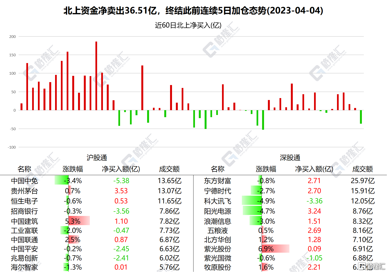 4月4日,北上资金今日净卖出A股36.51亿元,终结此前5日净买入态势。沪股通净卖出7.13亿元,深股通净买入29.51亿元。