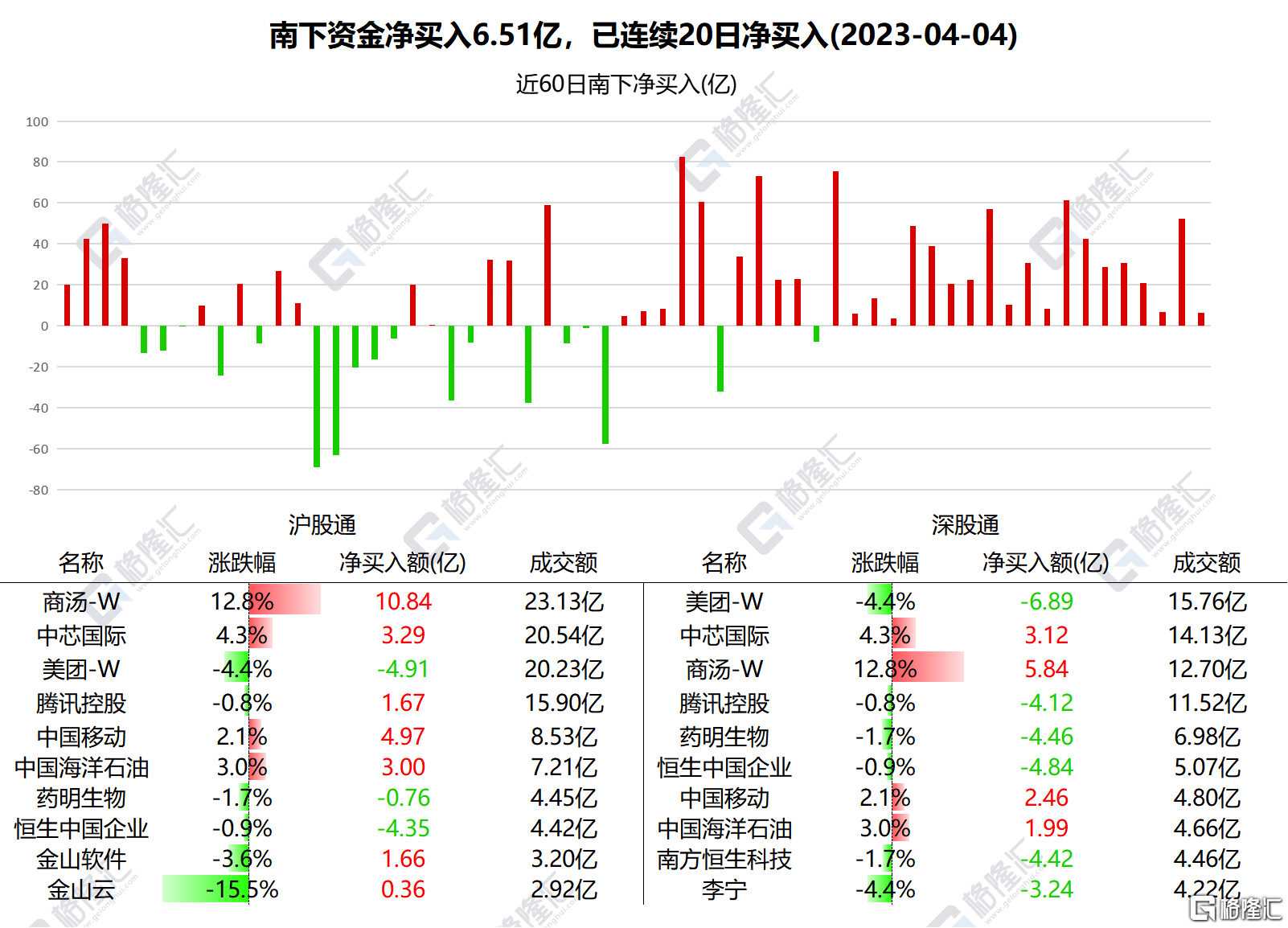 今日,南下资金今日净买入港股6.51亿港元,为连续20日净买入。其中,港股通(沪)当日成交净买入23.67亿港元;港股通(深)当日成交净卖出17.16亿港元。