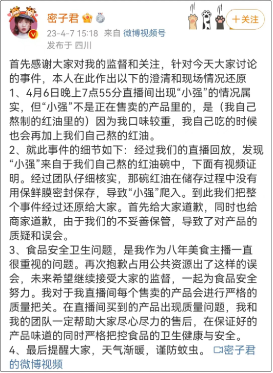 简介4月7日 美食博主密子君相关话题 冲上热搜榜 有网友爆料 在观看美食博主密子君的直播时 发现其售卖的无骨鸡爪中 有一只蟑螂 回放...