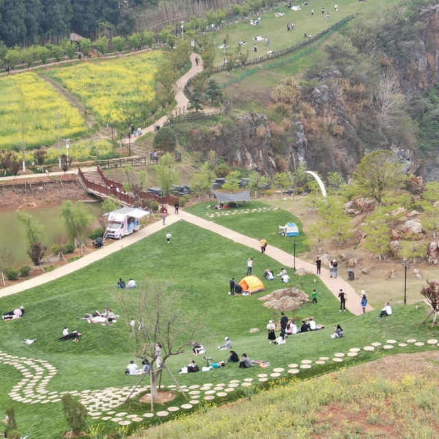 旅游区总占地约六平方公里,由奇山、潭水、森林、田园、湖泊、草甸、花海、矿洞、村湾组成。开园当日,记者实地走访被网上热炒的武汉版“稻城亚丁”。景区内,油菜花海和金色梯田美不胜收。景区南侧是百级石阶通往的高山草甸景点,草地顺着山势起伏,一棵“孤独的树”山茶矗立在山巅,和桌面壁纸一样美。这里能俯瞰整个景区的绝佳视野,远处的油菜花海、采矿旧址尽收眼底。从位于高处的草甸下来,是瀑布蓄水的明月池和灵山石林,旁边则是亲子草原体验区。再往里走,便是千株樱园、桃林蜿蜒直达谷底,是核心游览区域“矿坑花园”,也是整个景区拍照打卡的最佳地。