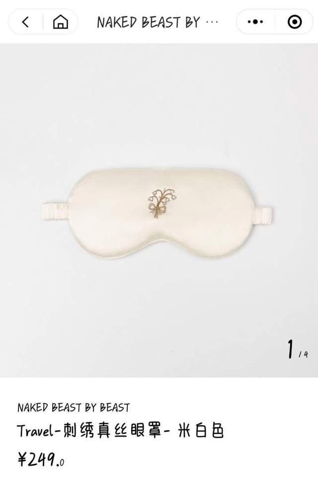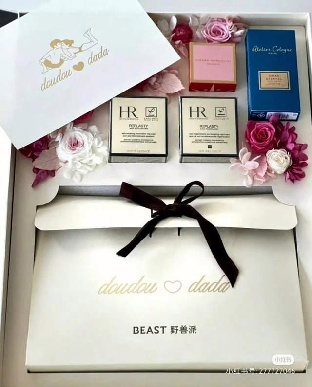 最下方打着黑色丝带结的,是BEAST野兽派定制真丝家居套装,包括一个收纳包、一个刺绣真丝眼罩,一双真丝旅行拖鞋。参考官方类似款的售价,这一套大约600元左右。不过,鞋子上定制的图案也有点意思,右鞋是朵莲花,是指女方何超莲;左鞋是棵柳树,应该就是男方窦骁了,是不是又想到了上面的诗句?