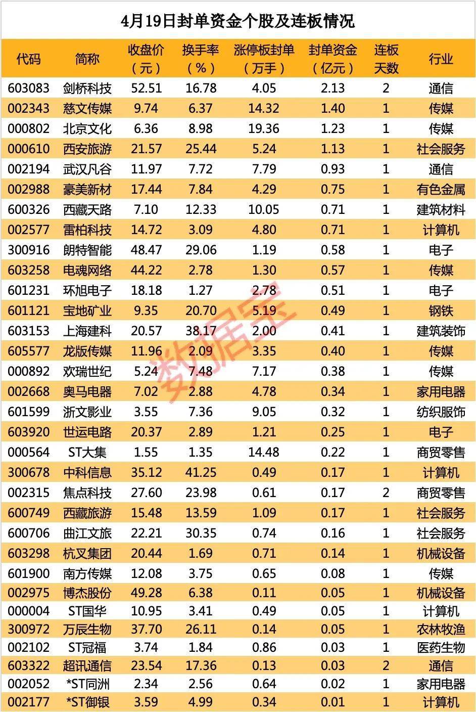 以封单金额计算,剑桥科技、慈文传媒、北京文化和西安旅游居前,分别为2.13亿元、1.4亿元、1.23亿元和1.13亿元。