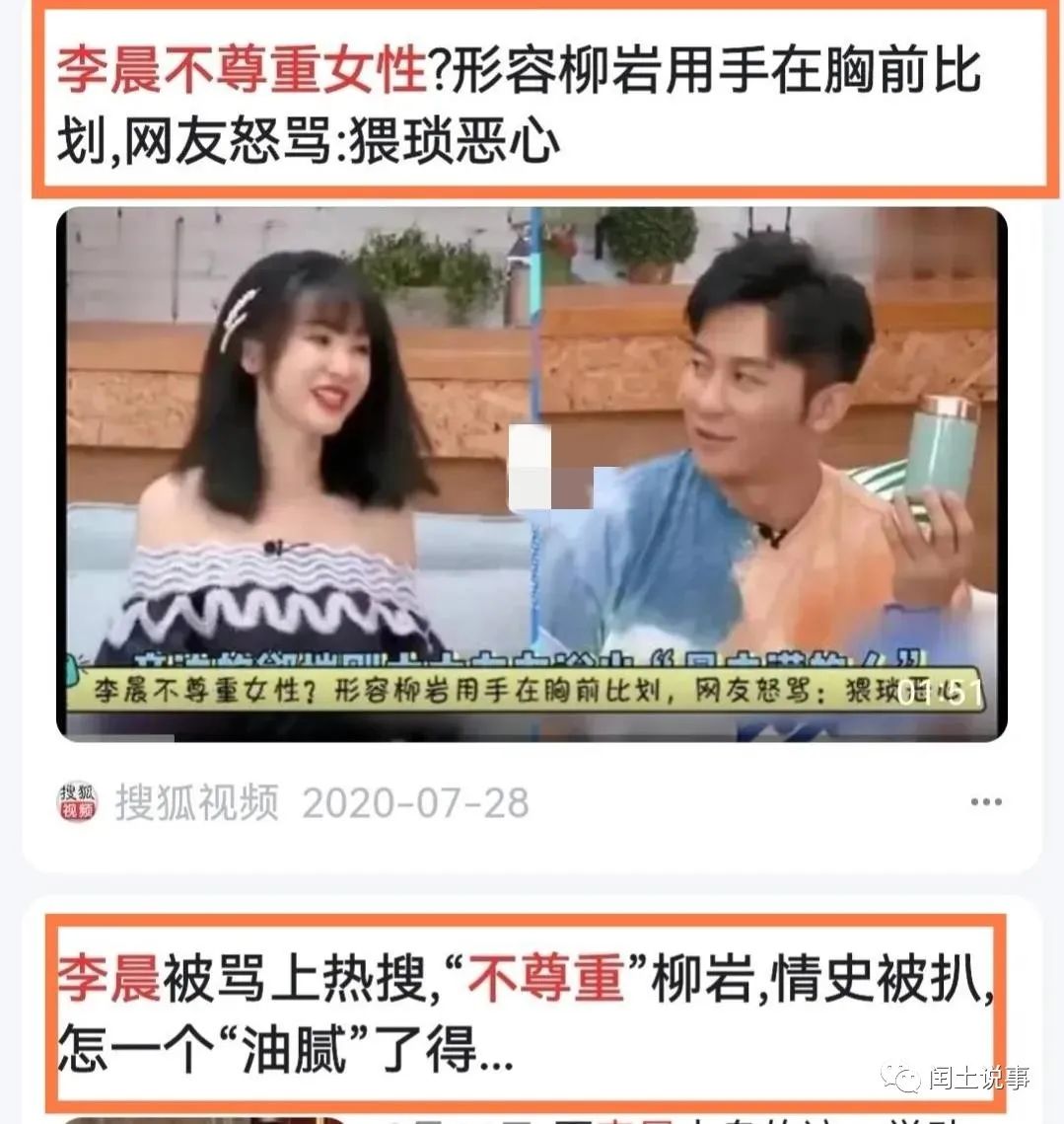除此以外,网友还扒出了很多关于李晨的“前尘旧事”,他曾经就在节目中用一些不好的手势来形容留言,举手投足间都充满了对柳岩的冒犯和不尊重,还被很多网友痛批是位猥琐油腻下头男。
