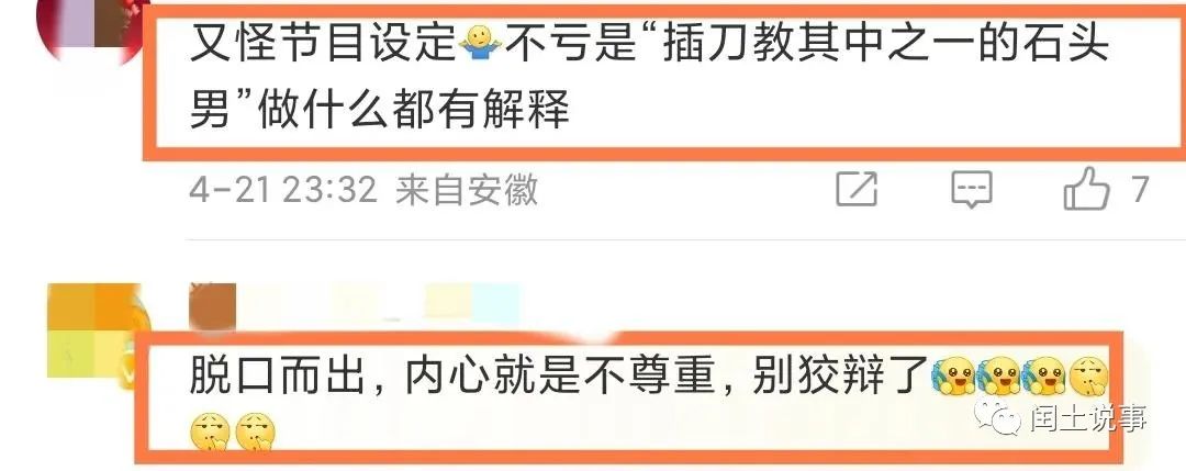 但也部分网友持截然相反的态度,又怪节目设定,不愧是“插刀教之一的石头男”做什么都有借口,下意识说出口的话才是内心的真实想法,脱口而出,内心就是不尊重。