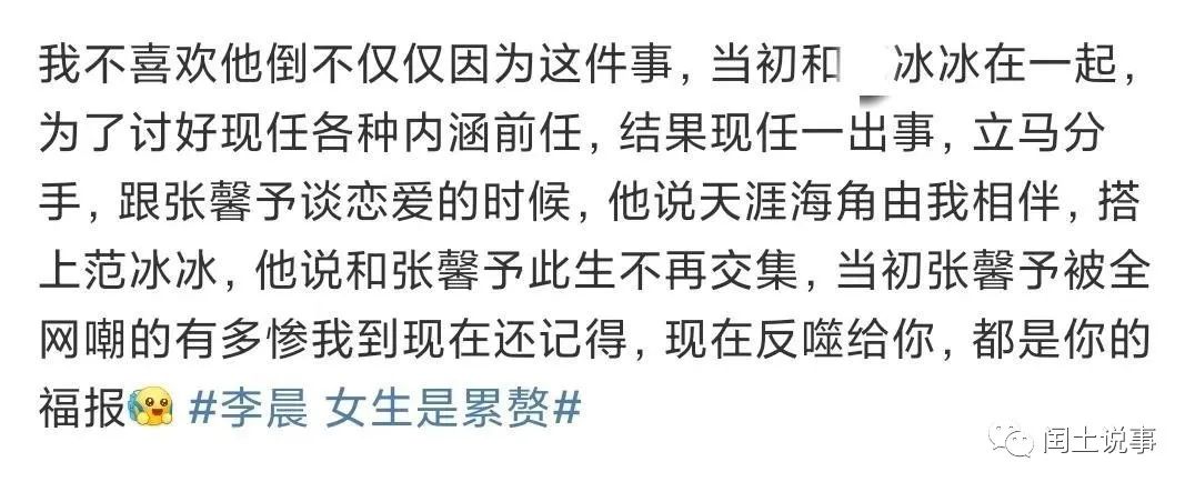 有网友表示,不喜欢李晨并不仅仅只是因为说女生是累赘这件事,当初他和冰冰在一起的时候为了讨好现任就各种内涵前任,结果现任一出事就立马分手了。如今全部都反噬回来了,这些都是李晨的“福报”。