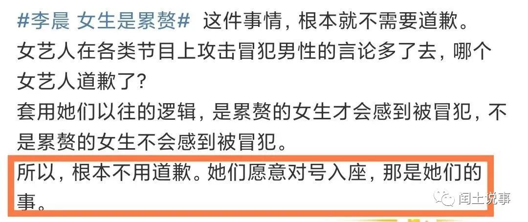 对于李晨的道歉,部分网友认为这件事情根本就不需要道歉,女艺人在节目上公然攻击冒犯男星的海了去了,都没见过哪个女艺人道过歉,也只有累赘的女生才会觉得被冒犯,所以她们愿意对号入座那是那她们的事情。