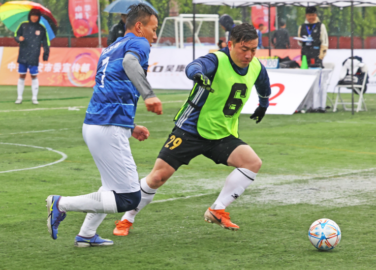 4月22日上午,“我参与 我健康”西安市首届社区运动会五人制足球总决赛在陆港运动公园开幕。选手们将在为期三天的比赛中发扬团队拼搏精神,感受快乐足球。记者现场看到,虽然开幕式当天西安下起大雨,但广大选手依然全力拼搏,在雨中享受足球运动的快乐。(文:记者 王瑞 图:记者 谢伟)