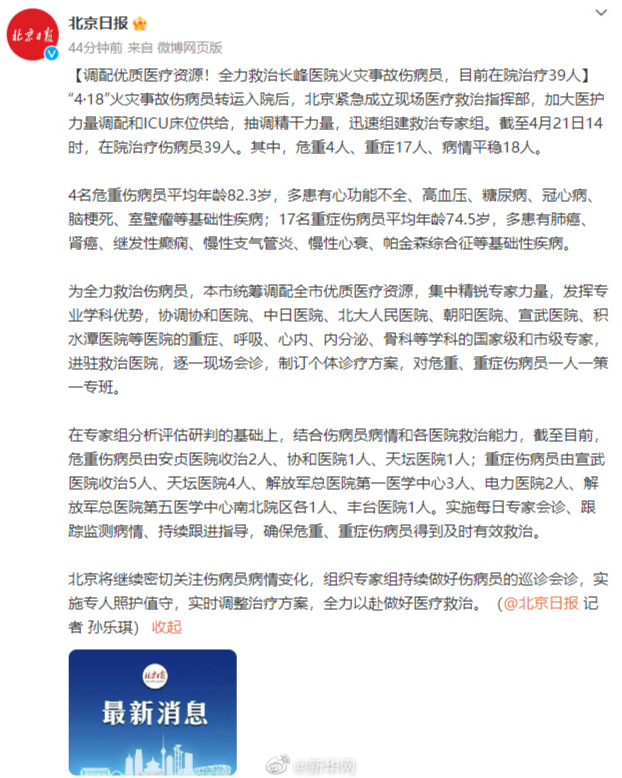 据北京日报 :“4·18”火灾事故伤病员转运入院后,北京紧急成立现场医疗救治指挥部,加大医护力量调配和ICU床位供给,抽调精干力量,迅速组建救治专家组。截至4月21日14时,在院治疗伤病员39人。其中,危重4人、重症17人、病情平稳18人。详情:危重4人、重症17人!最新通报