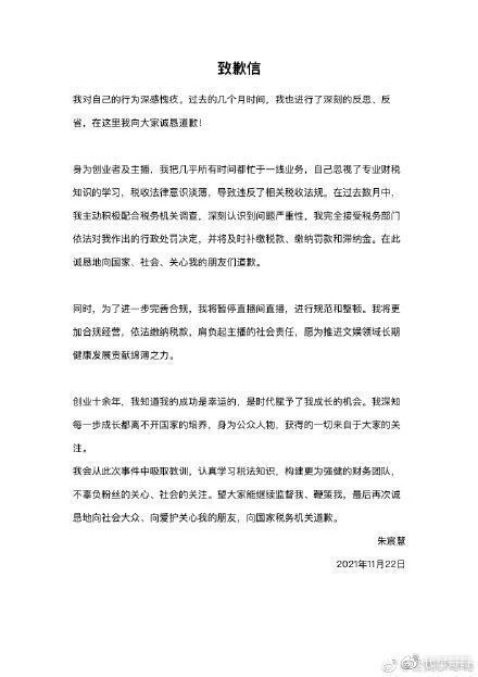 随后,雪梨和林珊珊为偷逃税被处罚道歉,称几乎所有时间都忙于一线业务,忽视了专业财税知识的学习,税收法律意识淡薄,导致违反了相关税收法规,完全接受税务部门依法作出的行政处罚决定,将及时补缴税款、缴纳罚款和滞纳金。同时,雪梨和林珊珊将暂停直播,进行规范和整顿。