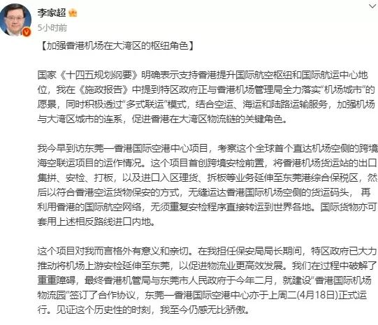 李家超上午在社交网页发文表示,今早到访东莞—香港国际空港中心项目,考察这个全球首个直达机场空侧的跨境海空联运项目的运作情况对他而言格外有意义和亲切。