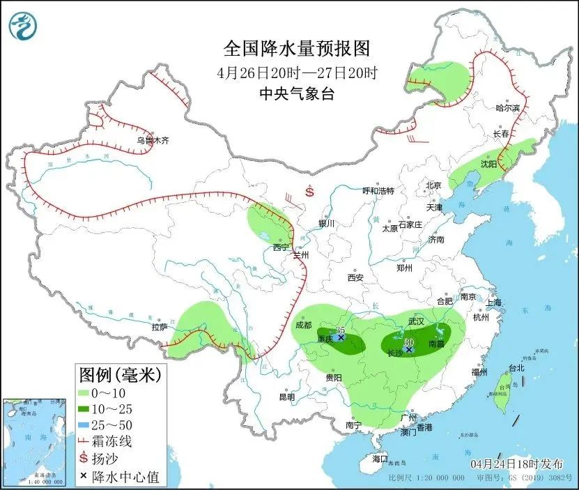 4月24日20时至25日20时,新疆北疆北部及沿天山地区、内蒙古东北部、黑龙江西部和北部、吉林西部、甘肃东部、西藏南部等地部分地区有小到中雪或雨夹雪;东北地区东部和南部、新疆北部、西藏东南部、华北北部、西南地区东部、江南、华南、台湾岛大部等地部分地区有小到中雨,其中,广西东南部、广东西南部等地部分地区有大雨(25~40毫米)。内蒙古中东部、东北地区大部、华北北部、山东半岛等地部分地区有5~7级风,新疆北部部分地区有7~8级风(见图1)。渤海、东海北部海域、台湾海峡将有6~7级、阵风8级的风。