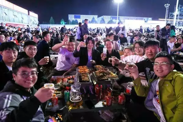 4月29日,游客在淄博市一家烧烤城吃烧烤。