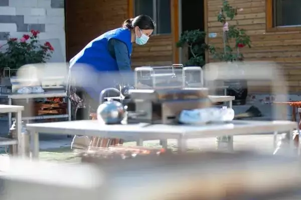 4月30日,一名社区工作者在淄博市高青县田镇街道帮助烧烤摊主摆放餐具。