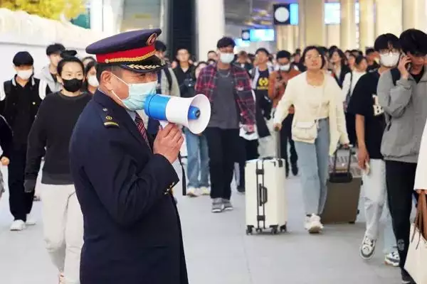 4月29日,淄博火车站工作人员在引导出站旅客。
