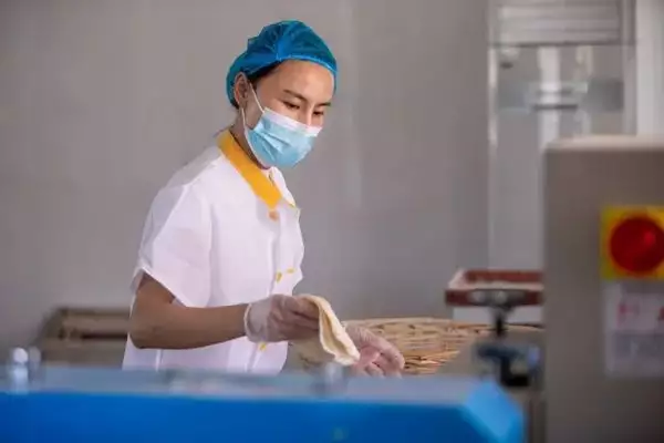4月30日,在淄博市高青县田镇街道一家食品加工企业,工作人员在赶制小饼订单。