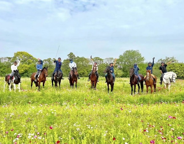 图说:游客骑马踏青“五一”假期也是上海长兴岛郊野公园踏春赏花的最佳时节,美丽香浓的百亩法国墨红玫瑰园、阳光草坪上的野奢露营派对以及迪卡侬-露营星球运动营等如期而至。露营爱好者们可以参与陆地冲浪、电音派对、咖啡学堂等多项时尚活动。