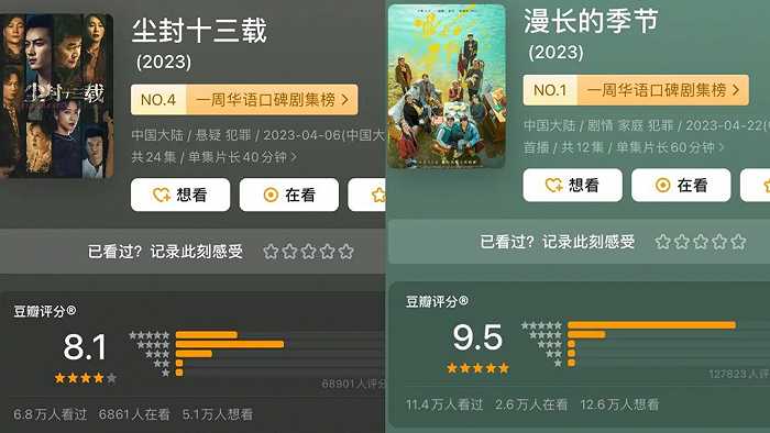 推理悬疑题材仍有稳定受众。1月播出的《大侦探第八季》在4月迎来完结篇,并保持在播放市占榜单第2名,豆瓣有3.5万人打出了8.7的高分。