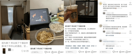 小红书爆文标题:标题运用了情绪词+解决方案的标题公式,以“累了、休假”的情绪词,引发用户共鸣,“酒店休假”引发了用户的好奇心,设置了悬念,会让读者想点击看看是怎么样的酒店,安利性强。