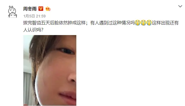 而就在不久前周冬雨还曾经发动态向网友哭诉,晒出半张脸的自拍问网友们有没有人遇到过和自己类似的情况。结果网友们反而开始搞怪,把周冬雨和一只脸肿起来的小狗P在了一起。