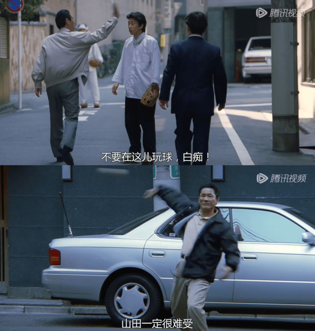 如电影开头,北野武跟同事们来到埋伏地点交班,两个年轻人在巷子里打棒球,球落到了北野武脚下,堀部训斥他们不能在这里打球。