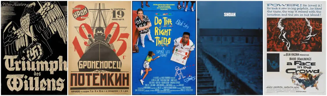 从左到右为本次片单六到十名:《意志的胜利》《战舰波坦金号》《不做亏心事》《浩劫》《登龙一梦》海报