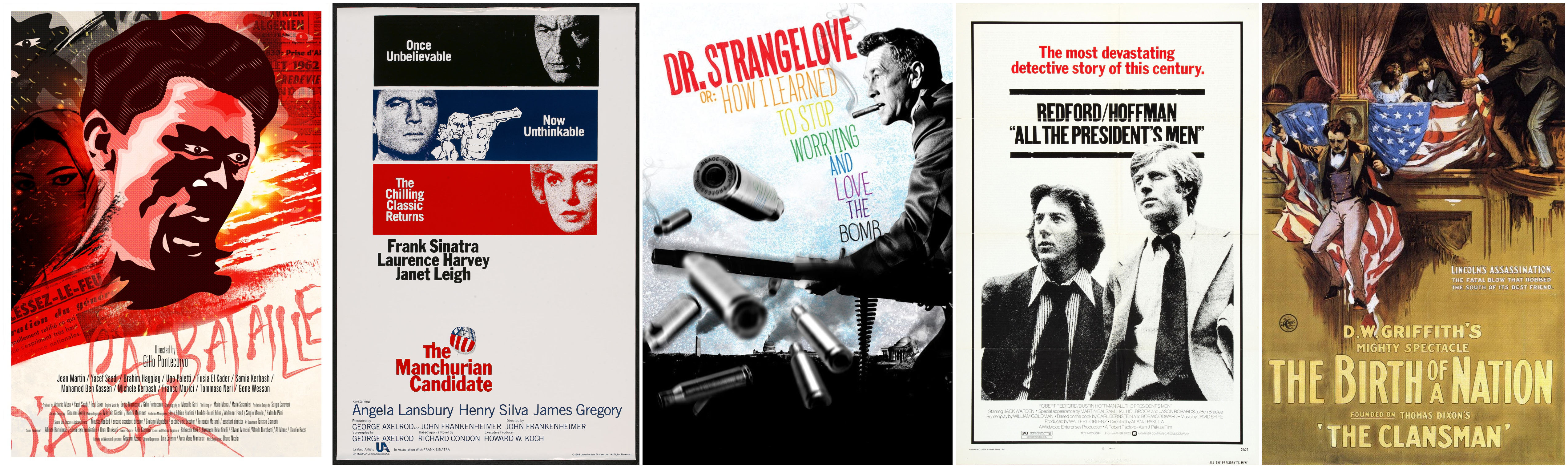 从左到右为本次片单一到五名:《阿尔及尔之战》《谍影迷魂》《奇爱博士》《总统班底》《一个国家的诞生》海报