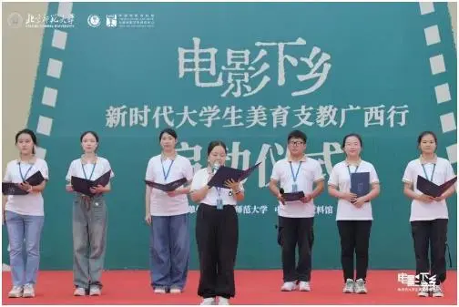 启动仪式上,由北汽集团倾情提供车辆支持的“电影大篷车”搭载着由北京师范大学师范生、影视专业学生以及青年文艺志愿者共同组成的“美育支教团” 来到现场并庄严宣誓。广西籍的北京师范大学2020级汉语言文学专业公费师范生潘玉娟和傅她作为“美育支教团”代表分享求学感悟。她们表示努力践行“学为人师,行为世范”的校训,希望未来能够成为乡村教育燃灯者,尽自己所能回馈家乡。