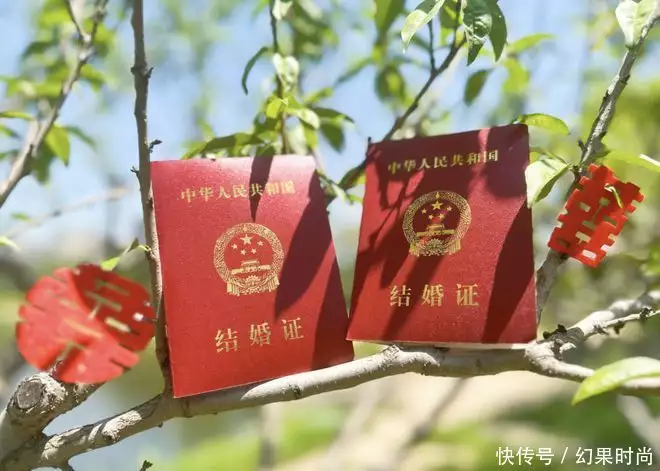 两人还把结婚证件摆在了树上,并且挂了两个“囍”字,仪式感满满,希望两人的婚姻也能像这满目的绿叶一样充满盎然生机,一起蓬勃向上,变得越来越好。