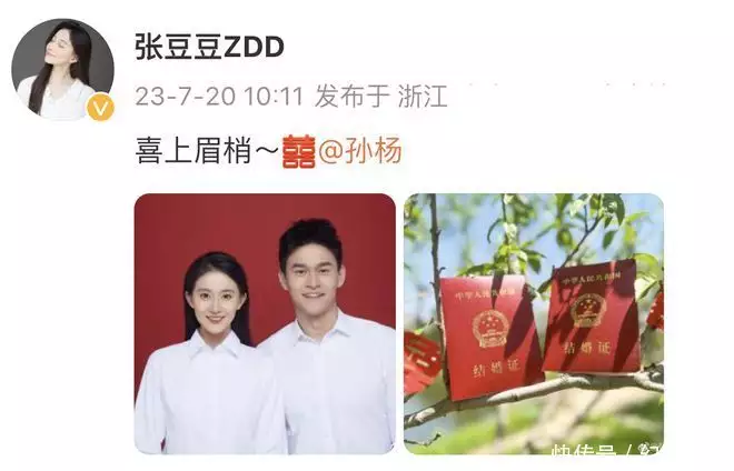7月20日,孙杨和张豆豆同时晒出结婚证件照,正式官宣结婚,直接跳过了官宣恋情的阶段,一步到位,可喜可贺。