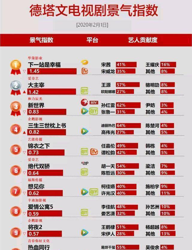 原标题:电视剧榜更新,《下一站是幸福》蝉联第一,《大主宰》表现强劲