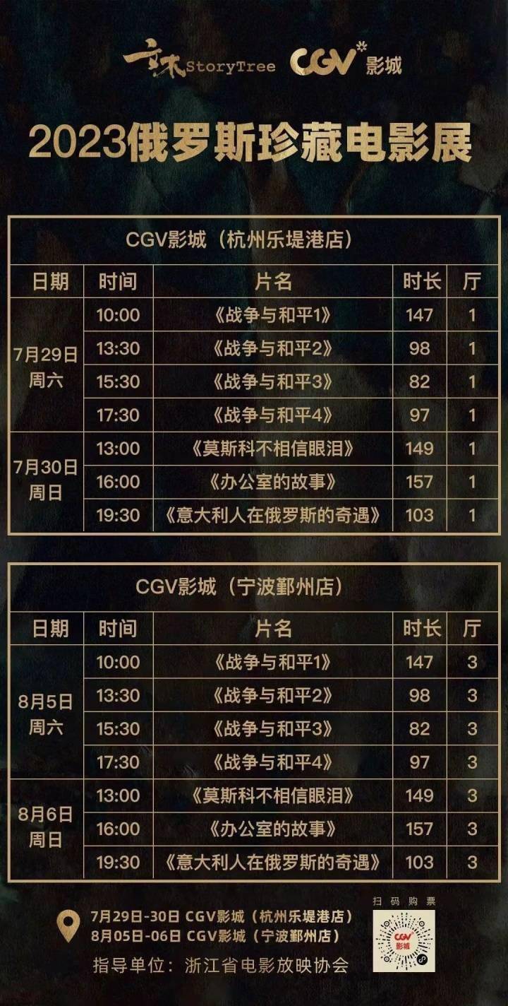 没有抢到票的影迷也不要着急,本次俄罗斯电影大师展将从7月29日一直持续到8月13日,杭州、宁波两地包括杭州百美汇影城、宁波影都(鄞州印象城)、杭州CGV影城(乐堤港店)、CGV影城(宁波鄞州店)共四家影院参与展映。