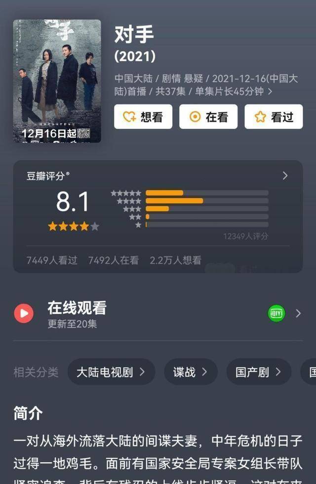 原创 电视剧《对手》评分出炉,豆瓣评分高达8.1,口碑佳作,实至名归