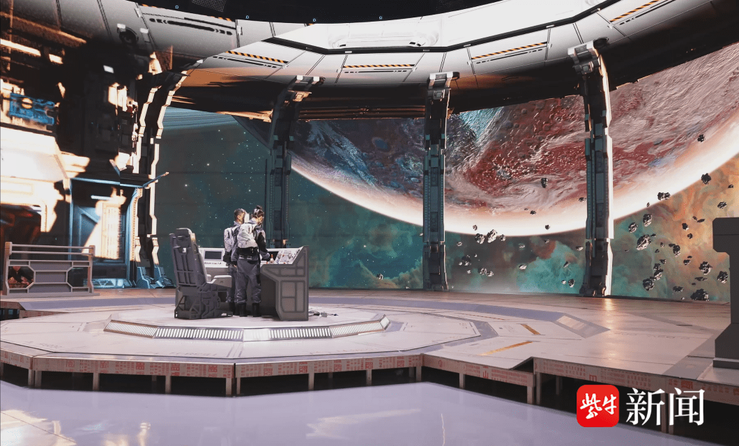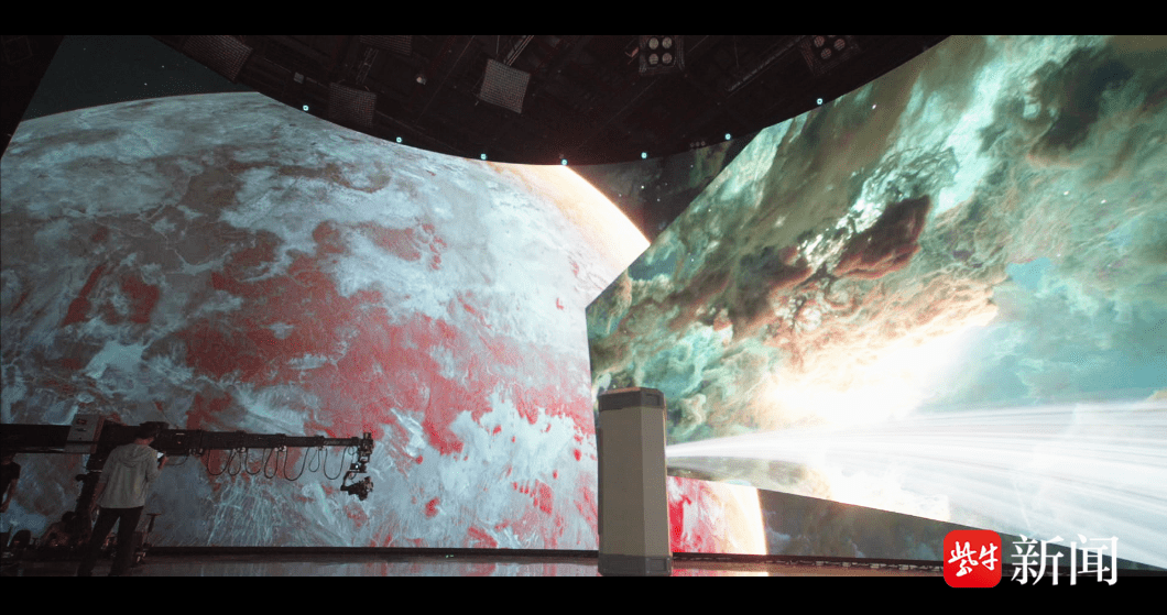 走进无锡国家数字电影产业园的摄影棚,一块大屏顶天立地矗立在人们面前:它长44米,高10米,直径23米,呈大角度圆弧形。站在这块屏下,一种沉浸感扑面而来,当天屏幕上显示的是宇宙场景,一大片绯红色的星云中,一颗巨大的蓝色星球闪耀着神秘的光芒,令人仿佛置身于浩瀚的星海之中,心中充满震撼。
