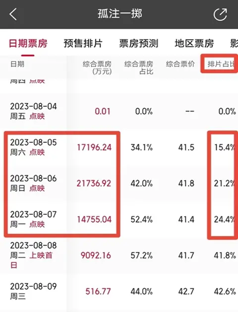 从数据来看,8月5日至8月7日点映期间,《孤注一掷》排片占比分别为15.4%、21.2%、24.4%。相比之下,暑期档影片《热烈》在点映期间的排片占比为4.5%~8.5%,《长安三万里》点映期间的排片占比不足5%。