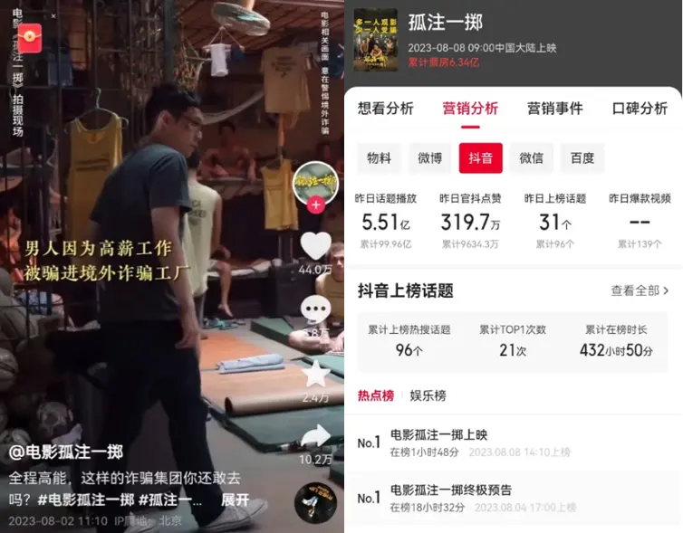 公开资料显示,早在点映之前,电影《孤注一掷》官方账号就在社交平台上发布了影片中“诈骗工厂”的相关短视频,并被大量转发。截至8月8日17时,数据显示,该电影在抖音话题累计播放量为99.6亿,抖音官方账号点赞数累计近1亿,远超其在其他社交平台的热度和互动量。