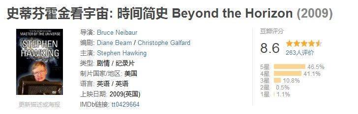 今天,可以和孩子再去回顾这部09年上映的纪录片,同样是Discovery探索频道出品,较早的画质或许不那么高清,但是霍金深入浅出的述说观点依然充满魅力。