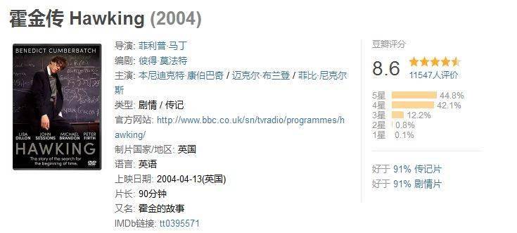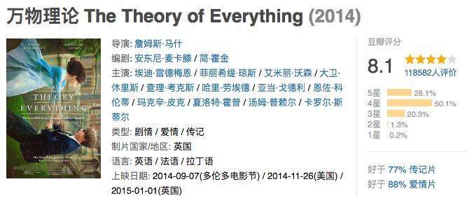 一个人在生前就被改编成电影,还不止一部,可见霍金对世人对魅力之大。《万物理论》提名第87届奥斯卡最佳影片、第72届金球奖……在传记片中已经达到了不错的水准。